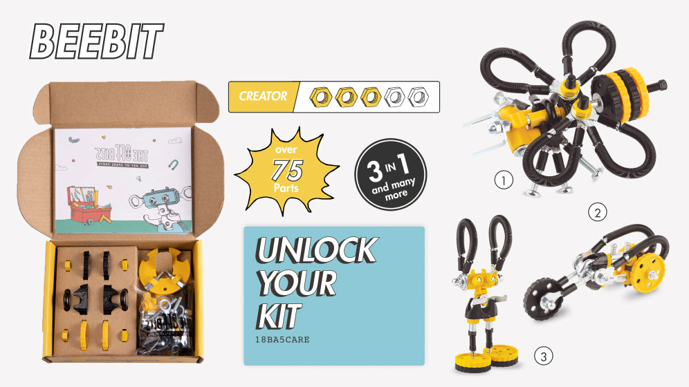 Pollinate the planet! BeeBit is a buzzy busybody. Featuring an assortment of colorful nuts, bolts and shapely bits, this integral insect produces delicious honey.