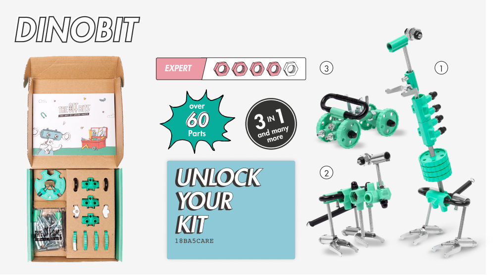 From tail to tooth! DinoBit is a history buff. Featuring an assortment of colorful nuts, bolts and shapely bits, this dinosaur is fiercely loyal.